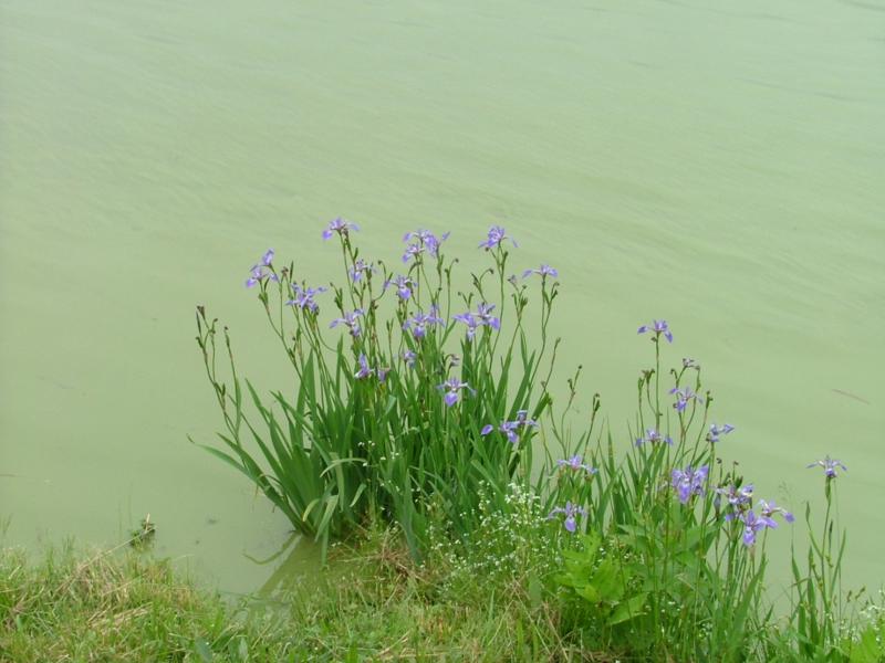 По берегам озера, подальше от пляжа много сиреневых ирисов.