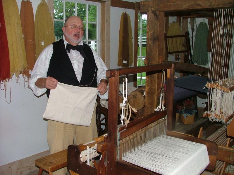 Ткач. В руках у него уже готовое полотенце. В станке — еще не законченное.