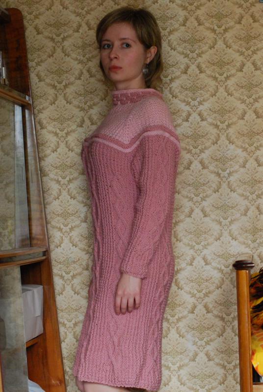 Мои розовые труды оказалиь велики. А как С оня будет носить розовое? В общем пусть сами разбираются. Сейчас на модели вижу ошибку в вывязывании горловины, но уже не исправить — платье далеко.. Попробую Маше из светлых розовых остатков свитер связать, хотя боюсь опять напортачить….