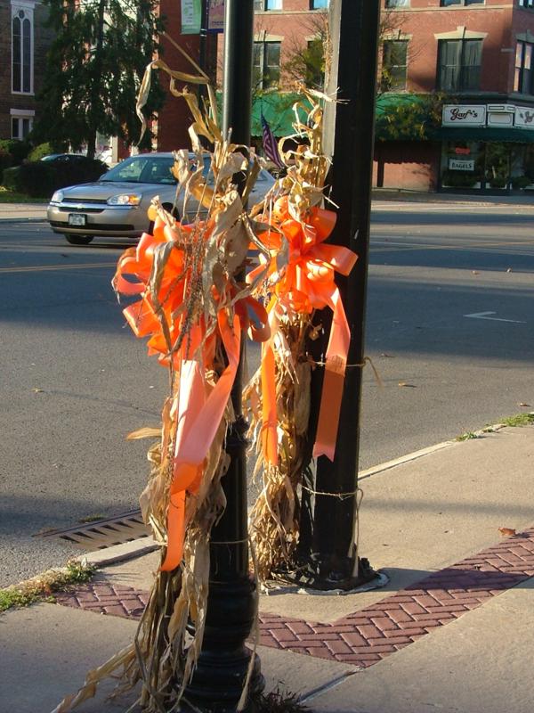 Фонарные столбы в осеннем убранстве.