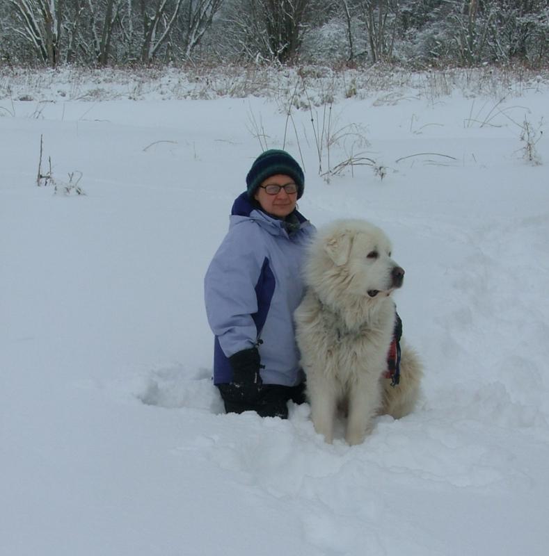 Оля сошла с тропинки. Она стоит, а Шарик сидит на тропинке.