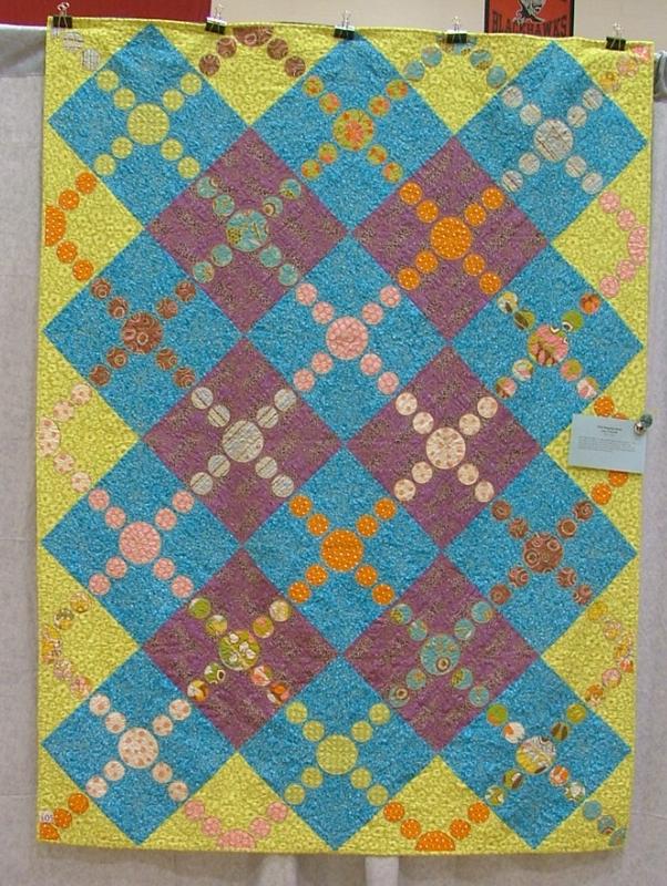 Квилт Лорри Чвозик. Кажется сложным, но крой простой — большие квадраты. Круги — это аппликашки. Конечно же, чтобы сшить даже и простой квилт да так аккуратно — нужны и терпение, и талант, и любовь к этому занятию. Все, чем Лорри обладает в полной мере.
