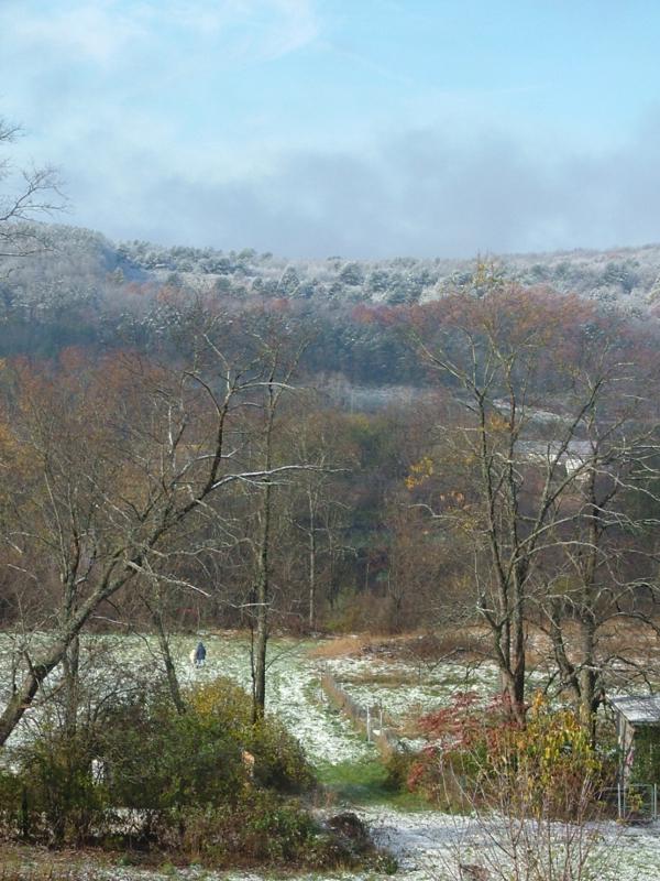 Заснеженные горы и поля. Оля с Шариком гуляют.