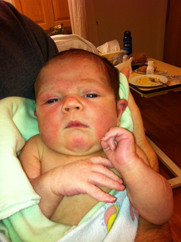 Вот так он выглядит на вторые сутки после рождения — типичный Матаев: нос картофелиной, взгляд «чего пристали?». Волосы черные, длинные, глаза пока светлые.