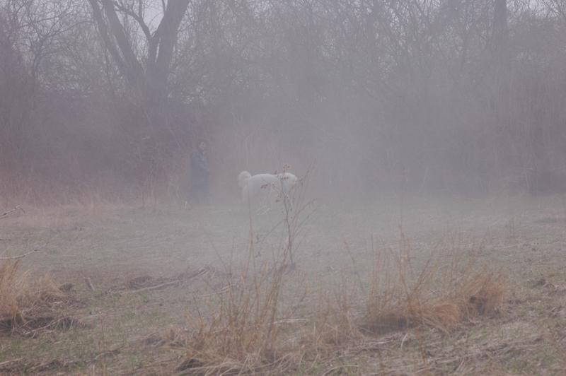 А вот Шарику туман не по нутру. Торопится домой.